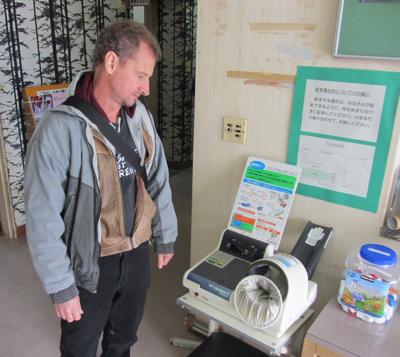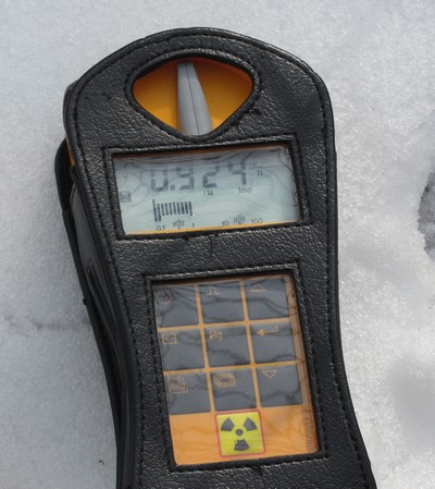 Outside, in the snow, we measured the radioactivity at ground level, just outside the temporary housing where the evacuated people are living now. It was about 10 times higher than normal background radiation.  Later, as we drove though other areas, the reading inside the bus was over 1 micro Sievert per hour.
