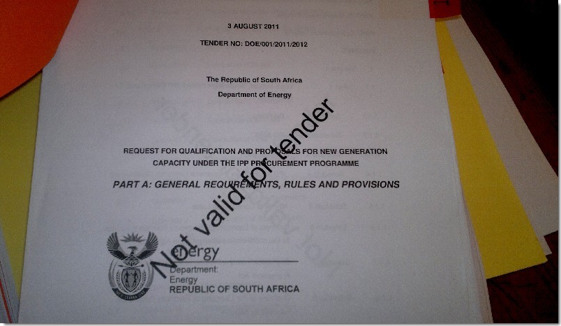 When the Department of Energy called for bids to supply renewable energy to the South African grid, they produced a bid document which described the conditions and information required from bidders.  This was only available to prospective bidders who paid a fee of R15 000, and signed a confidentiality agreement which included the stipulation to “not divulge or distribute any information in respect of this RFP or pass on any copies of this RFP”.