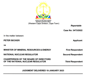 In the first Board meeting he attended in July 2021, there was a complaint initiated by Eskom that Becker’s well known anti-nuclear stance was a conflict of interest and it was resolved to get a legal opinion to inform the Board. The opinion was prepared by MacRobert attorneys, and the Chair forwarded this to the Minister on 11 October 2021 without sharing it with the full Board. The Chair also requested that the Minister dismiss Becker by writing in an accompanying letter “since the Minister is the competent authority that is responsible for appointment and removal of NNR board members.” For a summary as well as the full judgment, see below.