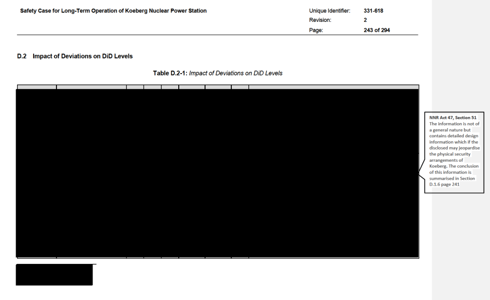 In response to this appeal, Eskom did an about-face and provided a new version of the Safety Case Report. Not only was this a later version of the document (version 2 as opposed to version 1a previously released to the public) but it also lacked the shotgun redactions scattered throughout it. Apart from three small redactions, the most significant remaining redactions are appendices D2 and D3 which are blacked out in their entirety. These appear in the index as “D.2 Impact of Deviations on DiD Levels” and “D.3 Impact of Deviations on Fundamental Safety Functions”. DiD refers to Defense in Depth, which is having multiple systems to ensure that if one fails, there is not a catastrophic accident.