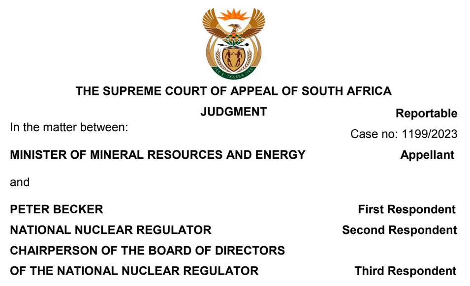 As described in a previous post both Minister Mantashe and the National Nuclear Regulator (NNR) appealed against Peter Becker’s victory in the Western Cape High Court in January 2023. Despite the High Court refusing leave to appeal, the appeal was heard by a full bench of five judges at the Supreme Court of Appeal in Bloemfontein on 17 May 2024.