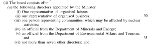 Since the split of the Department of Mineral Resources and Energy into the Department of Electricity and Energy and Department of Mineral Resources and Petroleum, there has not been clarity from the President as to which Ministerial office the NNR now falls under. Whoever is in that post should have already been in the process of appointing a community representative to the Board.