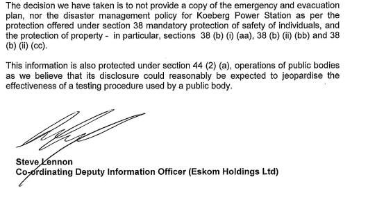 It is disturbing that Eskom refuses to release its emergency response plan for Koeberg. Could this be because realistically there is no feasible plan to get people to safety?
