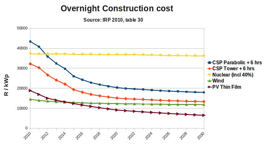 The South African government has researched this during the Integrated Resource Plan (IRP) process, and come to the same conclusion. This graph, extracted from the final IRP report, clearly shows that if the 40% cost overruns (which are inevitable in nuclear power) are included, then all the other forms of power generation are cheaper to build. Note, however, that these are the construction costs per kW peak only. Calculating the cost per kWh is complex, and requires many assumptions around capital costs and repayment terms, load factor, plant life time and in the case of nuclear, decommissioning costs, long term waste management, fuel costs and insurance premiums.